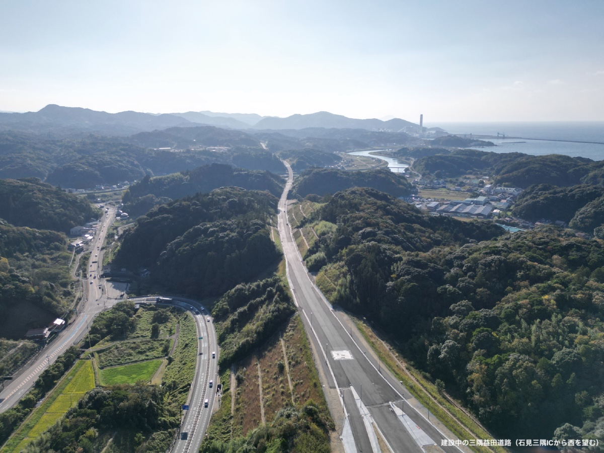 整備が進む山陰道で令和7年度、「石見三隅IC」から「遠田IC」間(約15.2㎞)が開通します。これにより、松江市・益田市間の移動時間が約10分短縮されます。