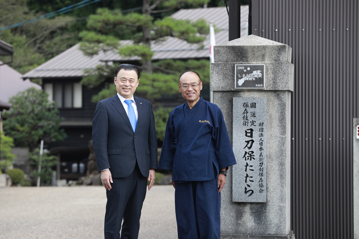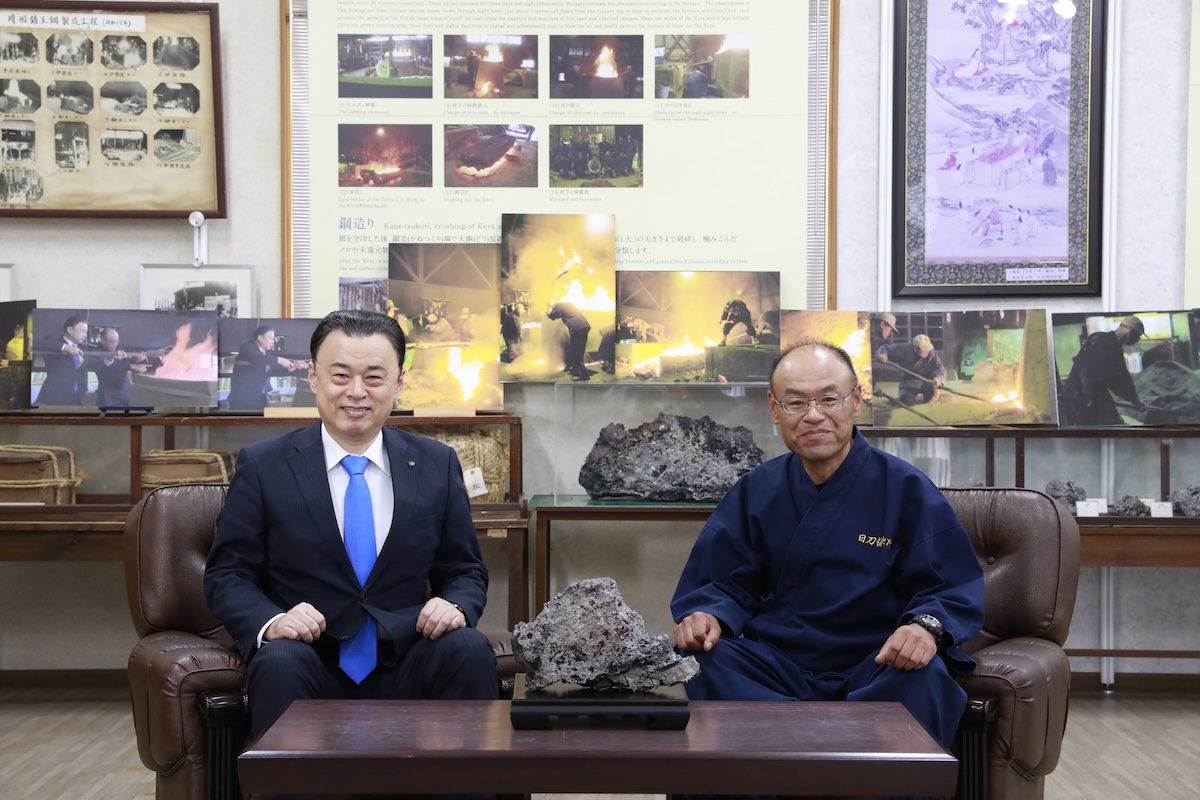 かつて島根県内で栄えた日本古来の製鉄法、たたら製鉄。終戦とともに、たたらの炎は途絶えていましたが、公益財団法人日本美術刀剣保存協会(日刀保)※1が奥出雲町で「日刀保たたら」として復元し、現在は株式会社プロテリアルの技術協力を受けて伝統の炎が灯され続けています。たたら操業の最高責任者である「村下」に新たに就任した堀尾薫氏※2に、丸山達也知事がたたら操業にかける思いや伝統技術の継承について聞きました。