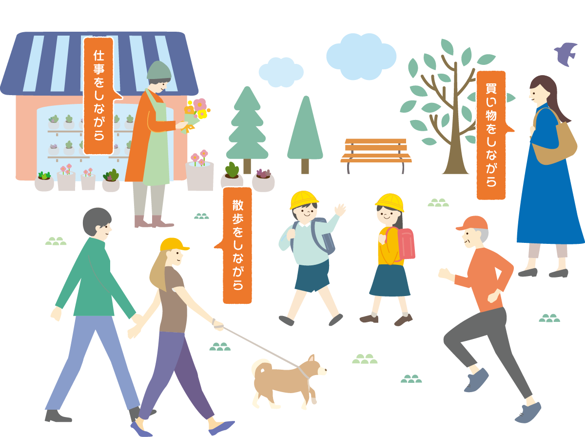 「ながら見守り」とは、買い物をしながら、散歩をしながら、仕事をしながらなど、日常生活や事業活動の中で防犯の視点を持って地域の見守りを行う活動です。例えば、「いつもとちょっと違うな…」、「あの人ちょっと変だな…」、「この場所を歩くには、ちょっと危険だな…」など、ちょっとした変化に気を配ってみるだけでも立派な見守り活動です。